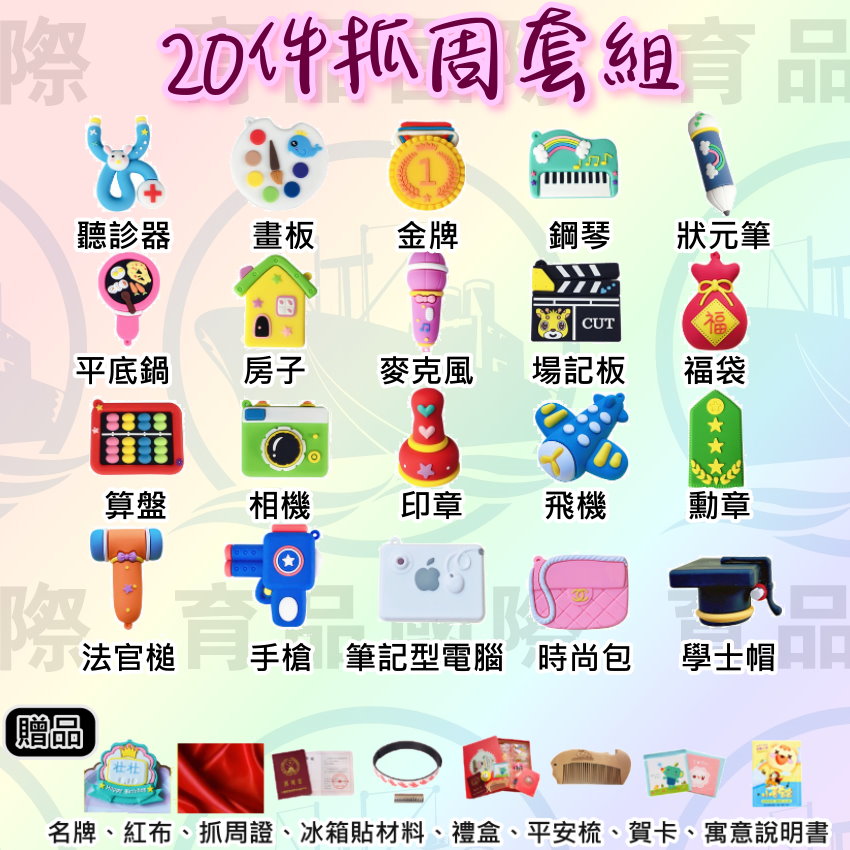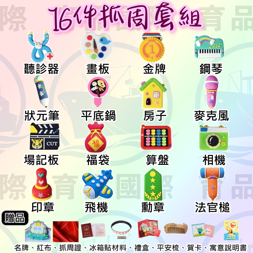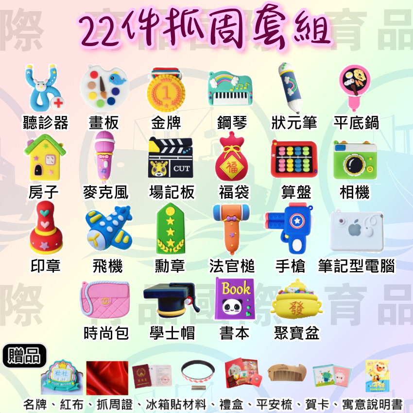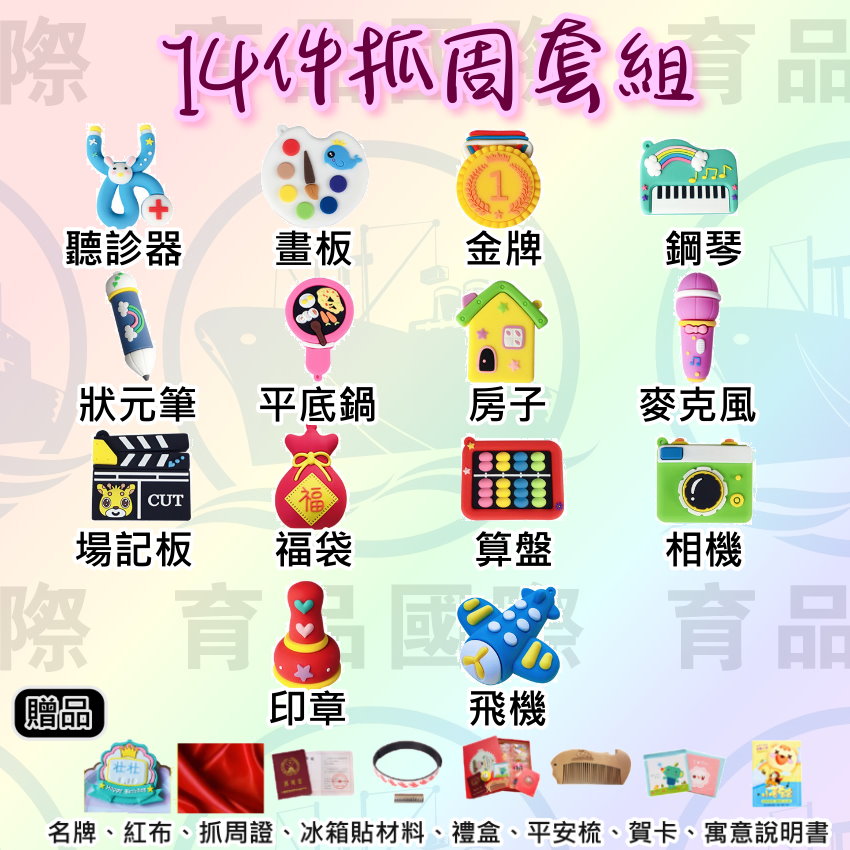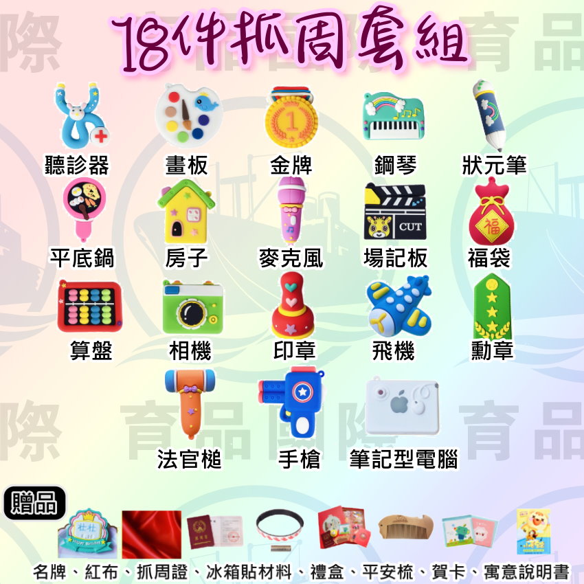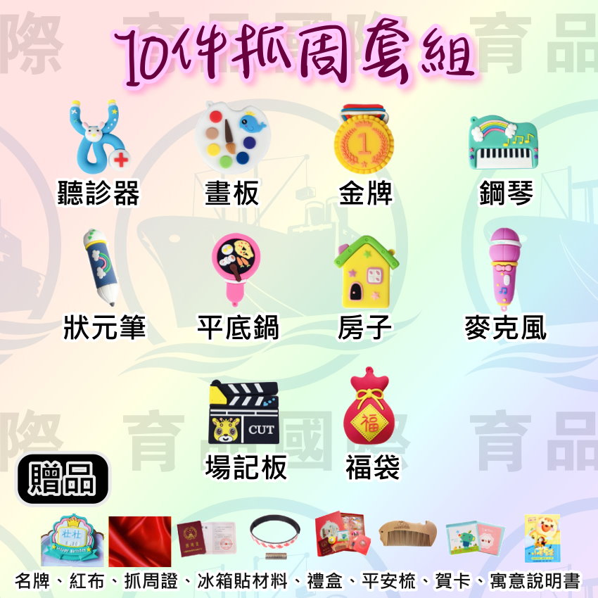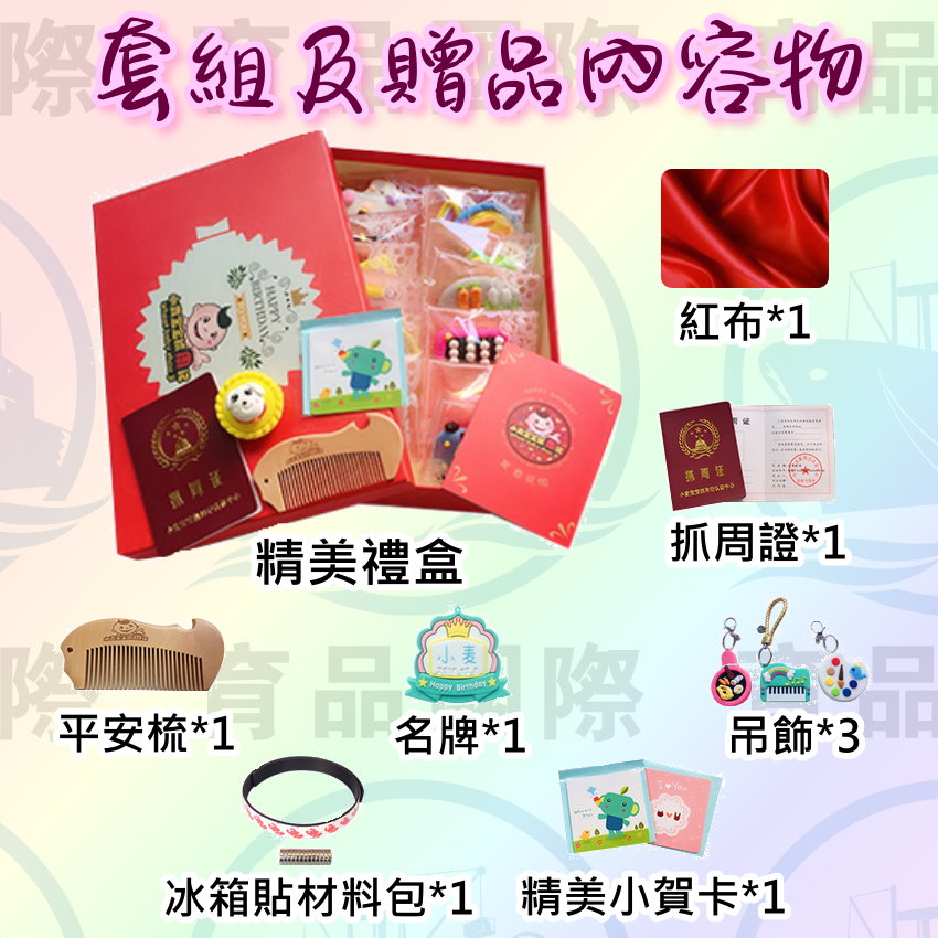 紅布、抓周證、禮盒、冰箱磁貼、平安梳子、賀卡、寓意說明書、吊飾。